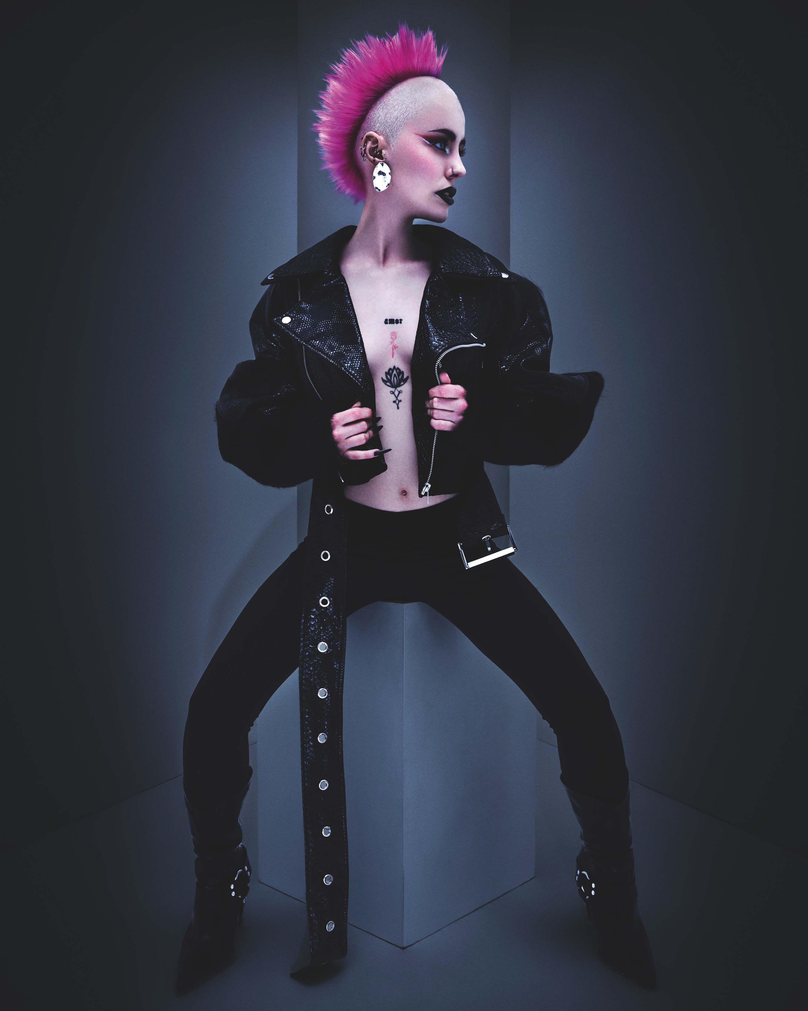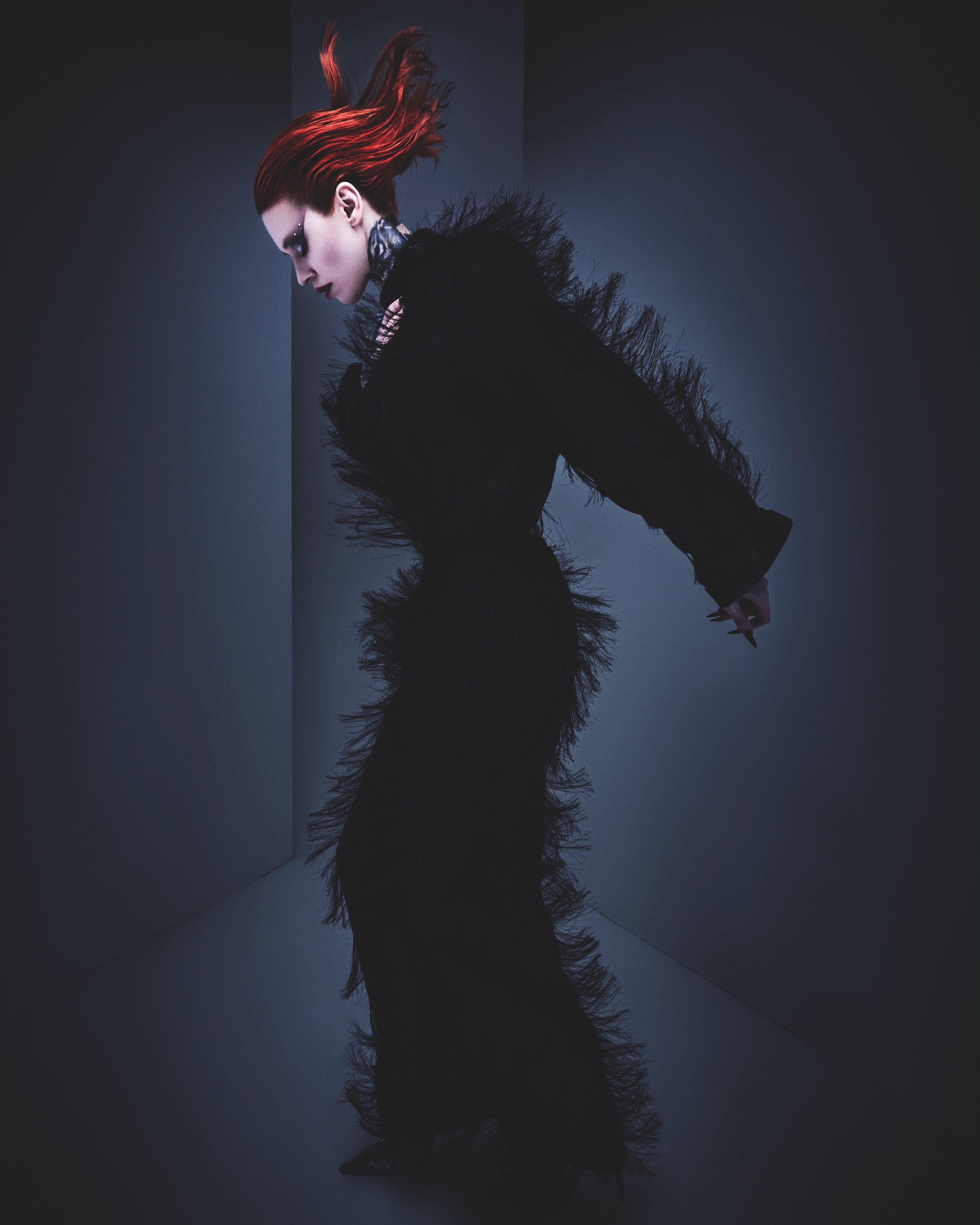 I generally take an image that isn’t hair related and use the emotion it portrays to create looks. I wanted the hair to feel extreme but also beautiful. I always try and find ways to push a look one step further, and the hair was a reflection of me doing that. I don’t consider myself a ‘cutter’, so I wanted to include haircuts that challenged me.