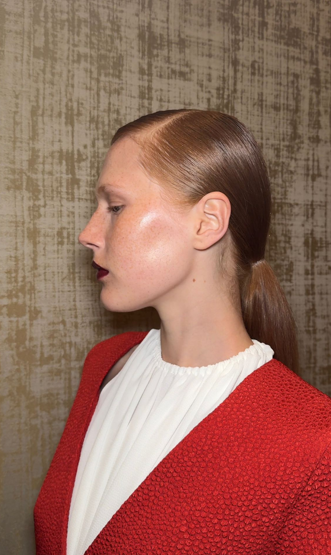 The hair stayed true to Roksanda's exploration of form using high gloss shapes with curves and graphic lines that felt both modern and timeless whilst staying true to Authentic Beauty Concept's ethos of mindful beauty. Hero products: Authentic Beauty Concept Hydrate Spray Conditioner, Cosmic Blow Dry Jelly, Glow Spray Serum and Working Hairspray