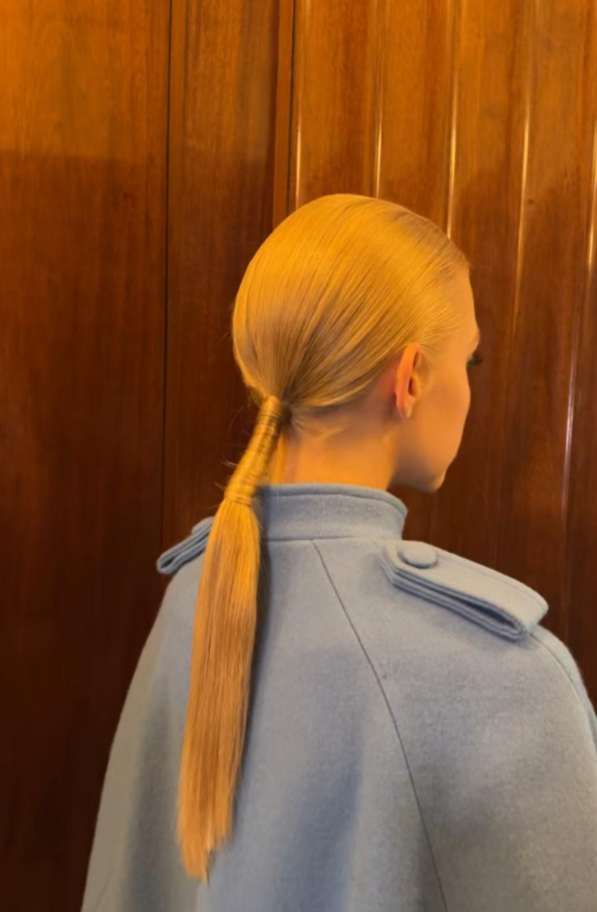 Philipp Haug created a sleek, powerful ponytail that framed the models with a strong, modern silhouette.The look featured a sharp side parting, with hair smoothed into a polished crown using mousse and gel from the Schwarzkopf Professional Session Label range. Ponytails were styled either tucked neatly into the clothing for a sculptural effect or left to fall clean and elegant, striking a balance between strength and simplicity