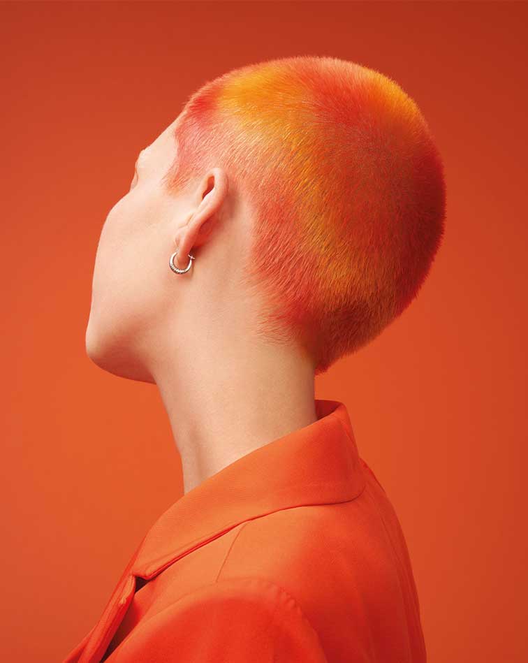 - For a pumpkin orange colour, it’s important with formulation to mix lots of different shades together to create a really seamless look, especially when blending on buzzed hair. For this look, I started with one shade and then added more pigment to the same bowl as I went through the hair. This allows for creative control and allows you to adapt the shade as you move through the technique.
